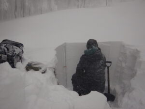 また、強い北西の風が吹き続けていますので、森林限界から上部では、雪崩の要因となり得るウインドスラブ(風によって運ばれた雪が板状に堆積した状態)が形成されていると予想されますので、風下側の雪の状態には十分に気をつける必要があります。