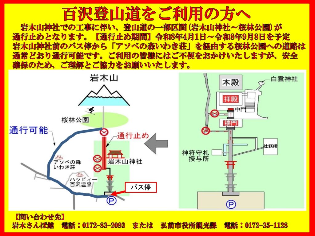 岩木山神社前のバス停から「アソベの森いわき荘」を経由する桜林公園への道路は通常どおり通行可能です。(pdfファイルは以下リンクより)