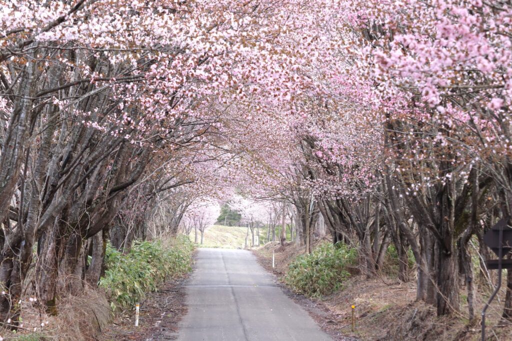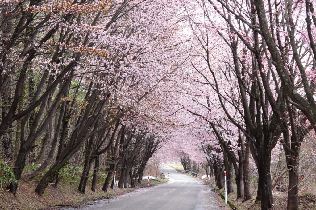 岩木山総合公園の付近の桜並木、桜のトンネルは満開となりました。今朝の山は風も冷たく肌寒かったです。服装にご注意してお越しください。