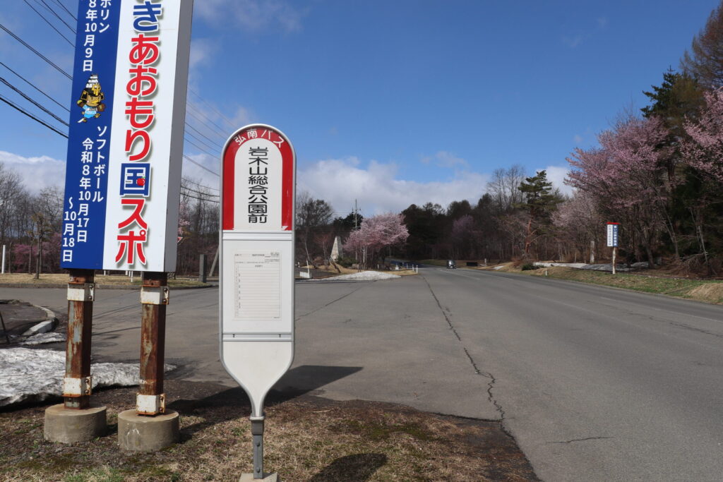 路線バス(弘南バス)でお越しの場合は、「岩木山総合公園前」バス停で降りて、20分ほど徒歩で坂道を下ると桜のトンネルの方に行くことができます。