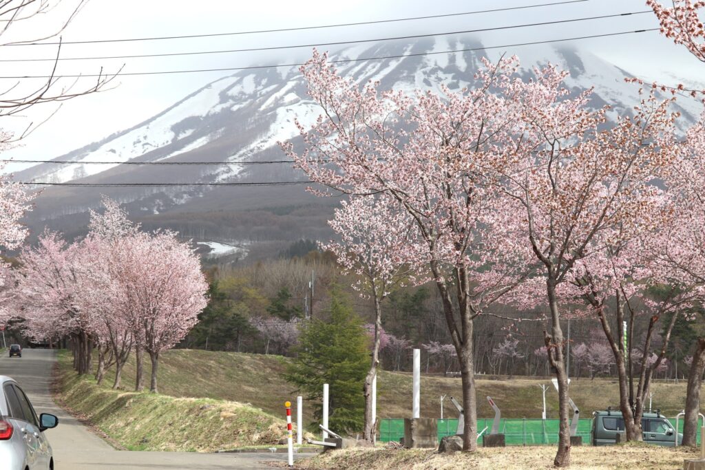 岩木山の桜並木は標高差があり、少しずつ見どころが上の方に移っていくので、長く楽しむことができます。終着点近くである岩木スカイライン向かいの桜並木は、本日時点でまだ開花前で、見ごろはこれからです。明日4/23には、岩木スカイラインが開通します。