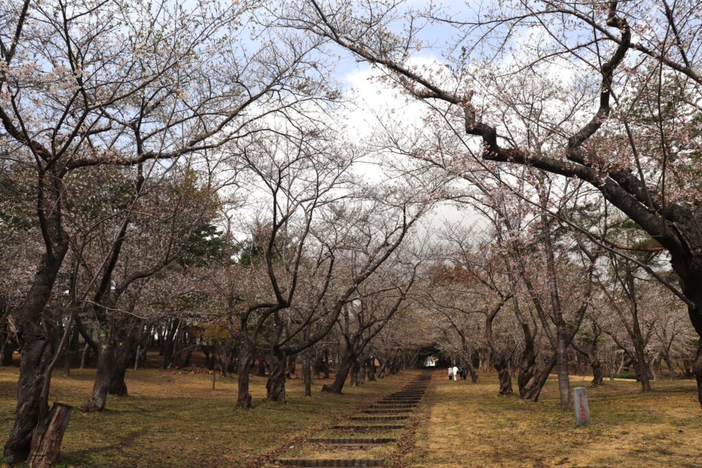 岩木山総合公園の付近の桜並木は引き続き満開です。強風のため花びらが舞うタイミングがありますが、桜のトンネルを楽しむことができます。少しずつ桜が散り始め、桜の開花は標高が上の方に移ってきております。