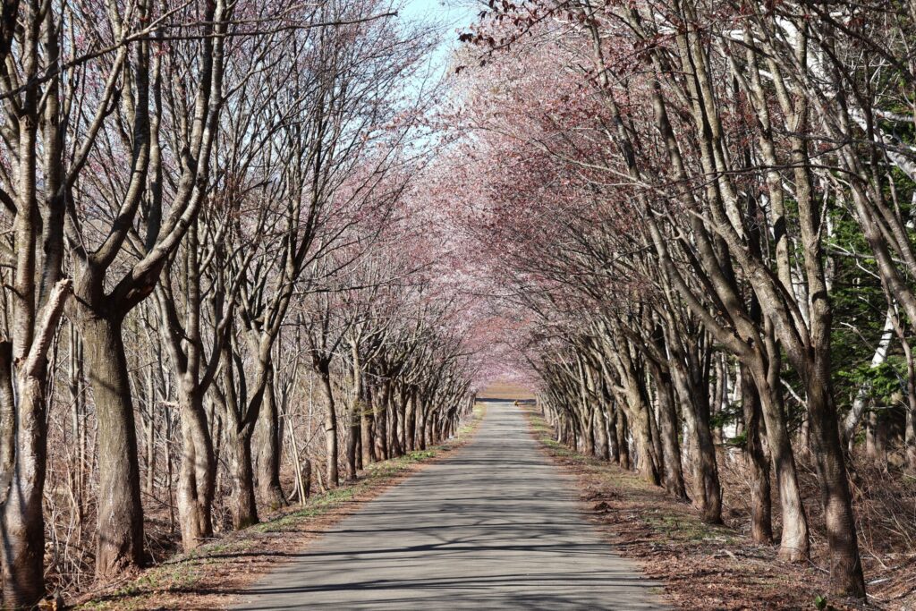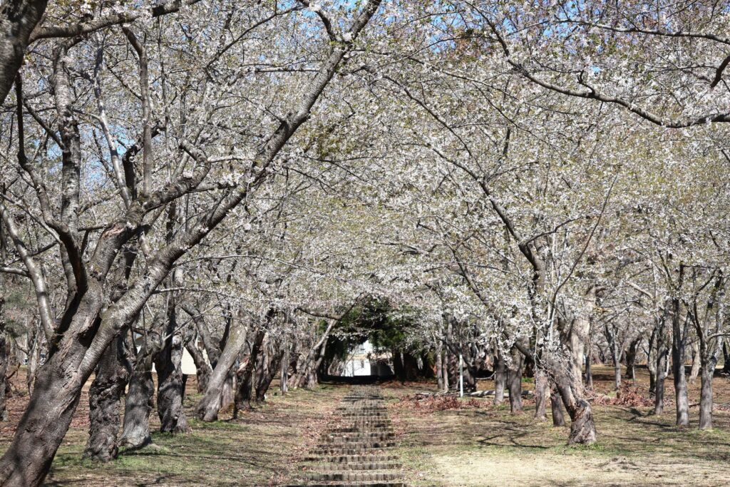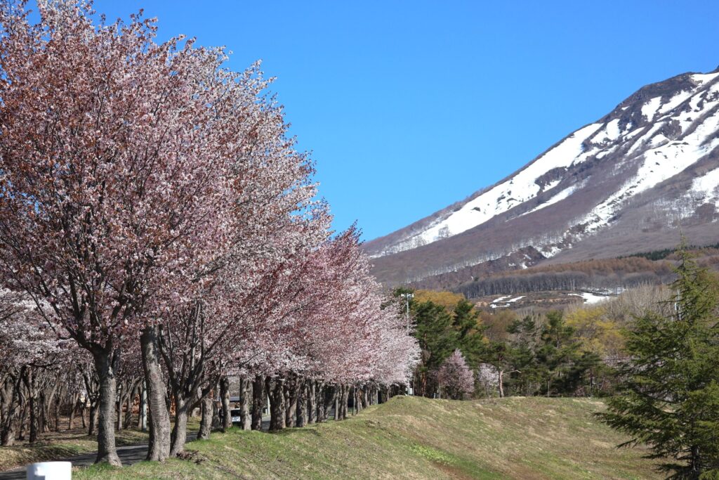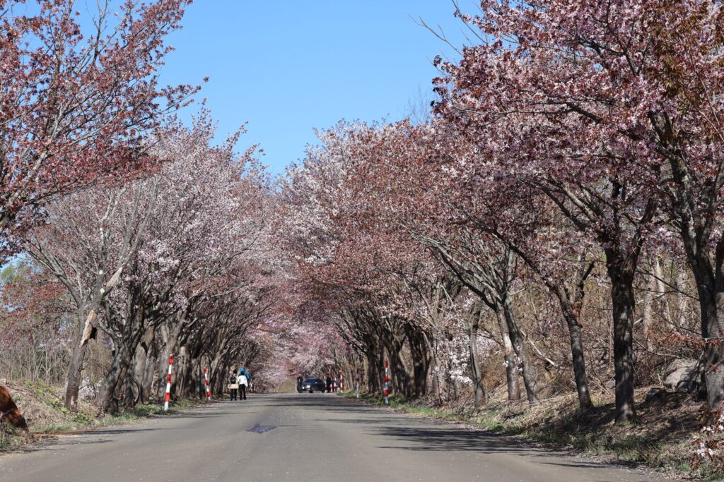 岩木山総合公園の付近の桜並木は、五部散りとなりました。桜並木の見どころは上の方に移り変わっています。
