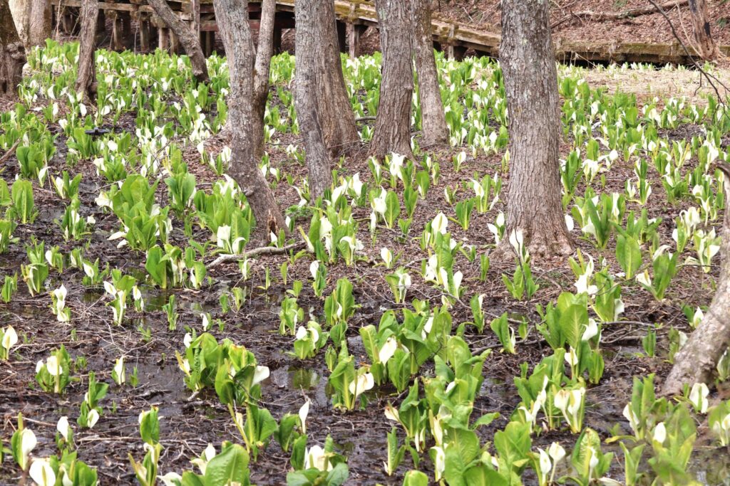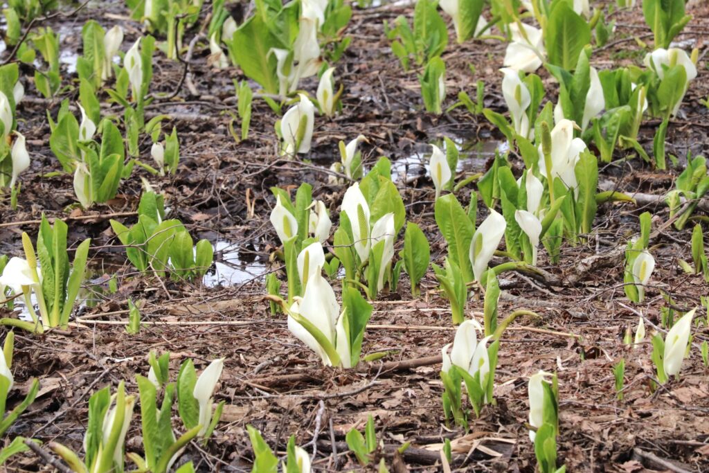 ミズバショウ沼公園は全面的に開花しており見ごろが続いています。花と葉が大きく育ってきました。数は少ないですがザゼンソウもミズバショウの合間に見ることができます。
