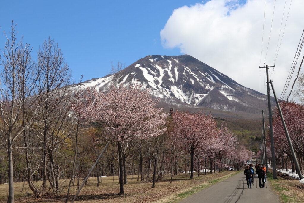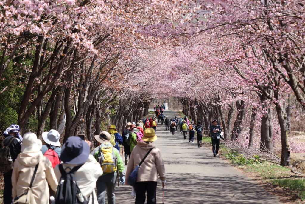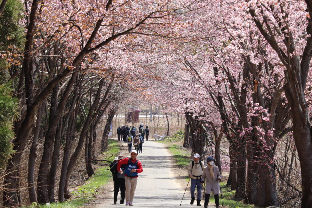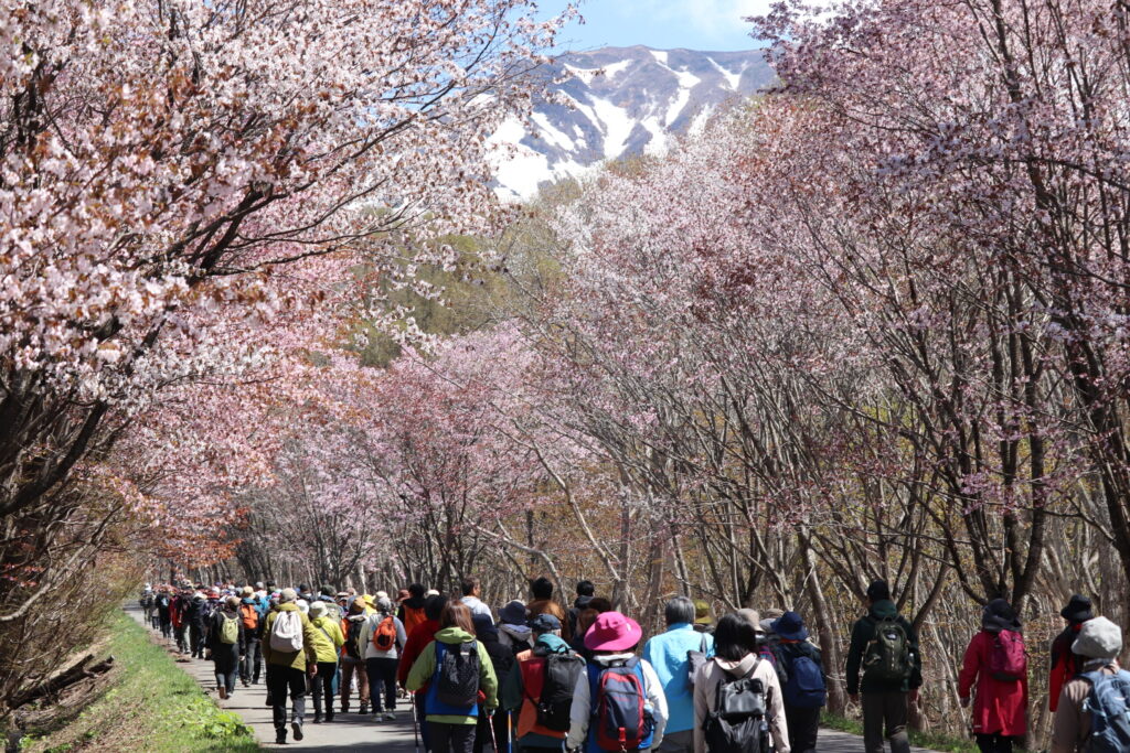 本日は岩木青少年スポーツセンター主催の「岩木山さくらウォーク」が開催され、嶽温泉~湯段温泉~枯木平の全長約6kmのコースを約120名でウォークしました。天気にも恵まれ、満開のオオヤマザクラと共に最高のさくらウォークとなりました。
